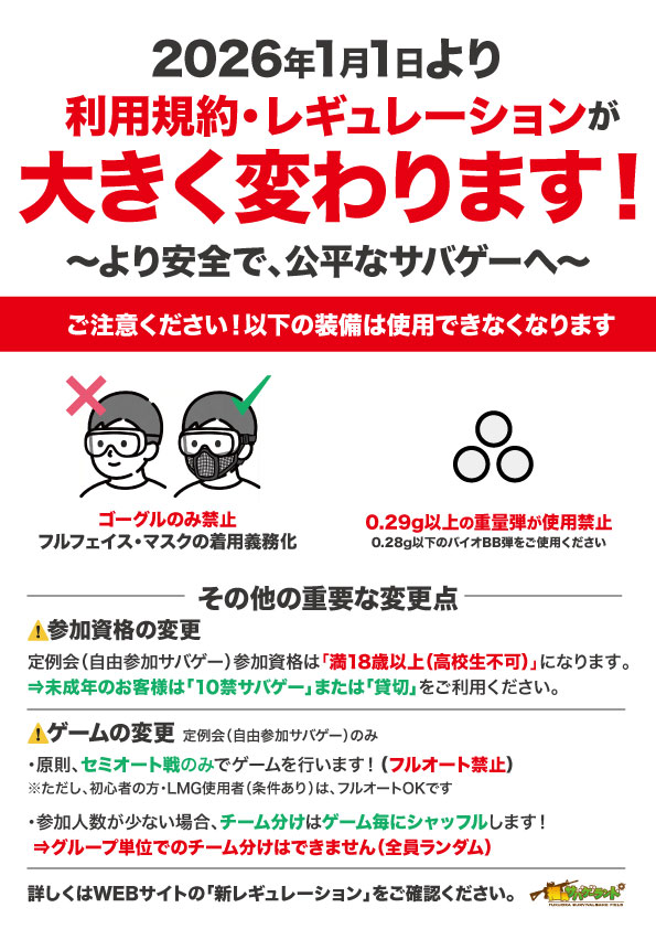 日頃より福岡サバゲーランドをご愛顧いただき、誠にありがとうございます。 当施設は2026年1月1日より、利用規約およびレギュレーション(ルール)を大幅に改定いたします。